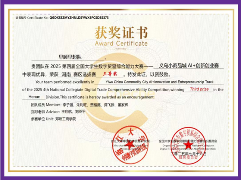 郑州工商学院财税学院代表队在2025年全国大学生数字贸易综合能力大赛河南赛区选拔赛义乌小商品城AI+创新创业赛道中斩获佳绩