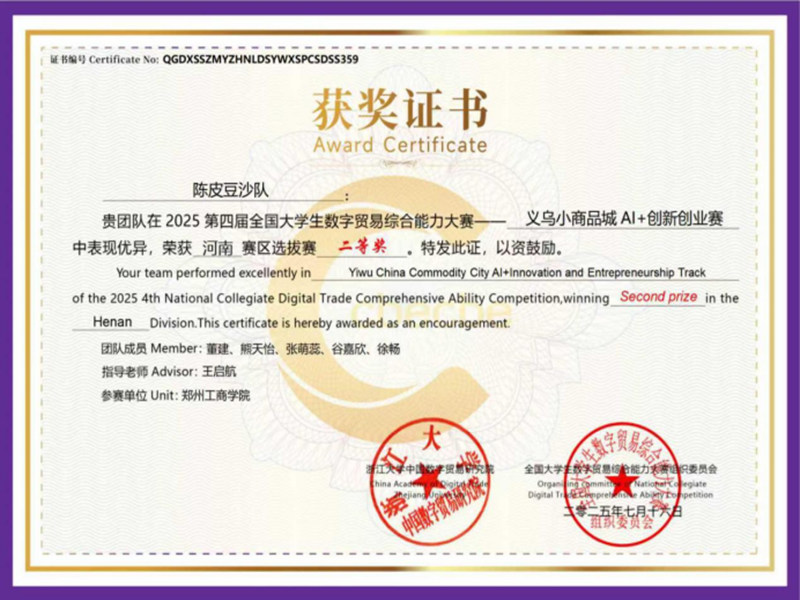 6月30日,2025年全国大学生数字贸易综合能力大赛河南赛区选拔赛圆满落幕。郑州工商学院财税学院代表队凭借扎实的专业素养与创新的团队协作,成功斩获二等奖1项、三等奖2项,为学校赢得荣誉。